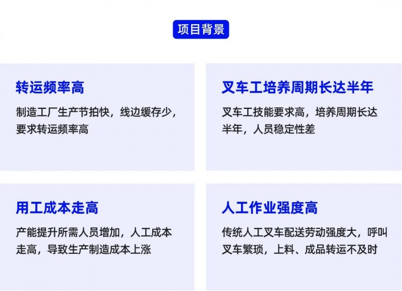 無人化搬運(yùn)削減叉車駕駛?cè)藛T8人、作業(yè)叉車4臺(tái),極大降低生產(chǎn)制造成本及叉車維護(hù)保養(yǎng),年平均節(jié)省成本近百萬元!