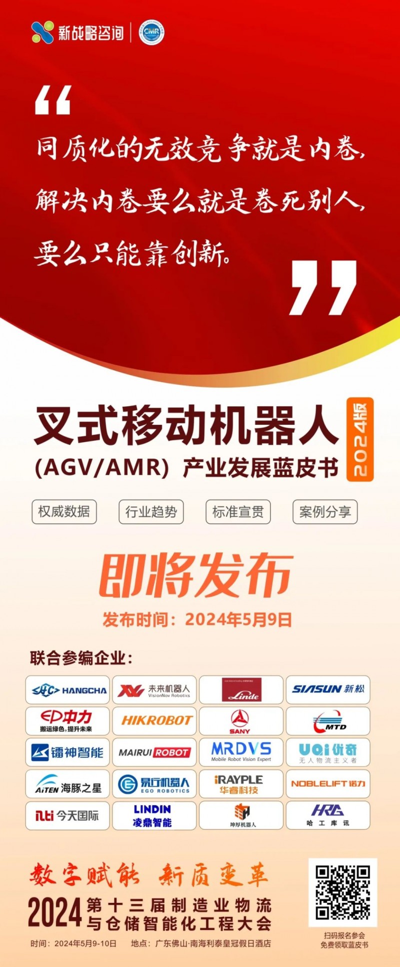 2024年,為了更好地探析當(dāng)前無人叉車市場最新發(fā)展情況及趨勢,推動無人叉車深入應(yīng)用,彰顯行業(yè)品牌力量,由CMR產(chǎn)業(yè)聯(lián)盟主編,杭叉智能、未來機器人、林德、新松、浙江中力、海康機器人、三一機器人、機科股份、鐳神智能、邁睿機器人、邁爾微視、UQI優(yōu)奇、海豚之星、易行機器人、華??萍肌⑸虾VZ力智能、今天國際、凌鼎智能、坤厚智能、哈工庫訊等20家無人叉車主流企業(yè)聯(lián)合編制的《叉式移動機器人(AGV/AMR)產(chǎn)業(yè)發(fā)展藍(lán)皮書(2024版)》將在5月9日舉辦的“inktype="text" imgurl="" imgdata="null" data-itemshowtype="0" tab="innerlink" data-linktype="2" hasload="1">第十三屆制造業(yè)物流與倉儲智能化工程大會暨第二屆全球叉式移動機器人峰會”上正式發(fā)布,參會人員可現(xiàn)場領(lǐng)取藍(lán)皮書紙質(zhì)版一份,敬請期待!